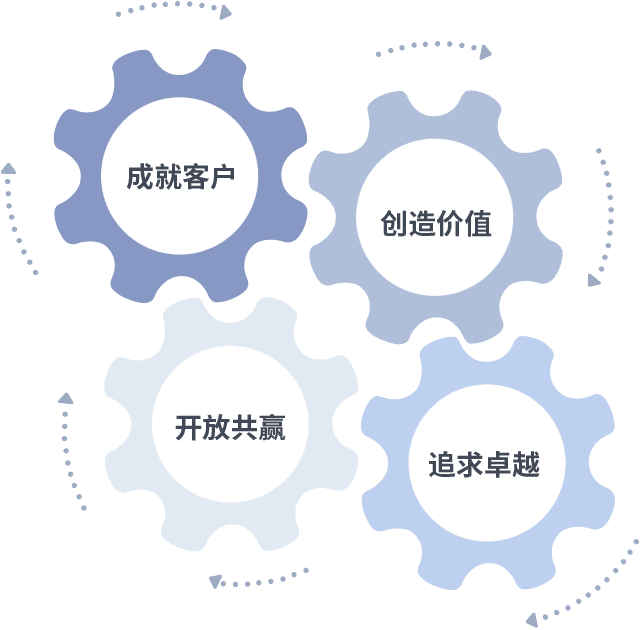 成就客户是一切决策的出发点,,创造价值是衡量所有工作的标准,,追求卓越是我们做事做人的态度,,,,开放共赢是我们的格局也是最终的结果。。。。价值观的齿轮环环相扣,,,,推动着组织里的每个人不断向前。。